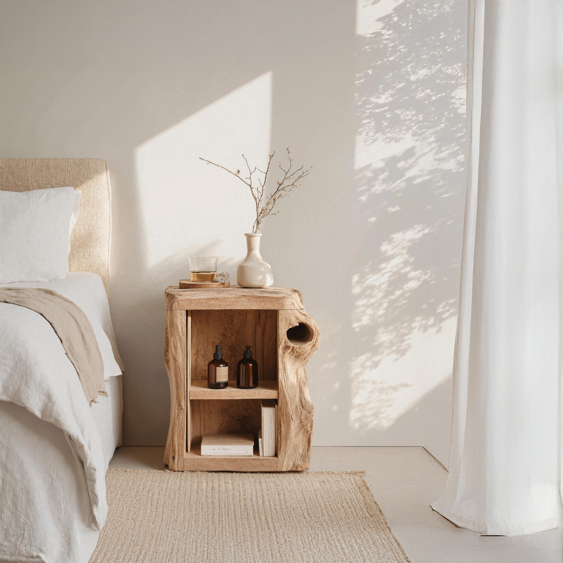 Crafted by hand from solid natural wood, each nightstand is built to last and finished with natural oils and waxes for a smooth, tactile feel. The wood’s unique knots, grain patterns, and warm tones add character to every piece.