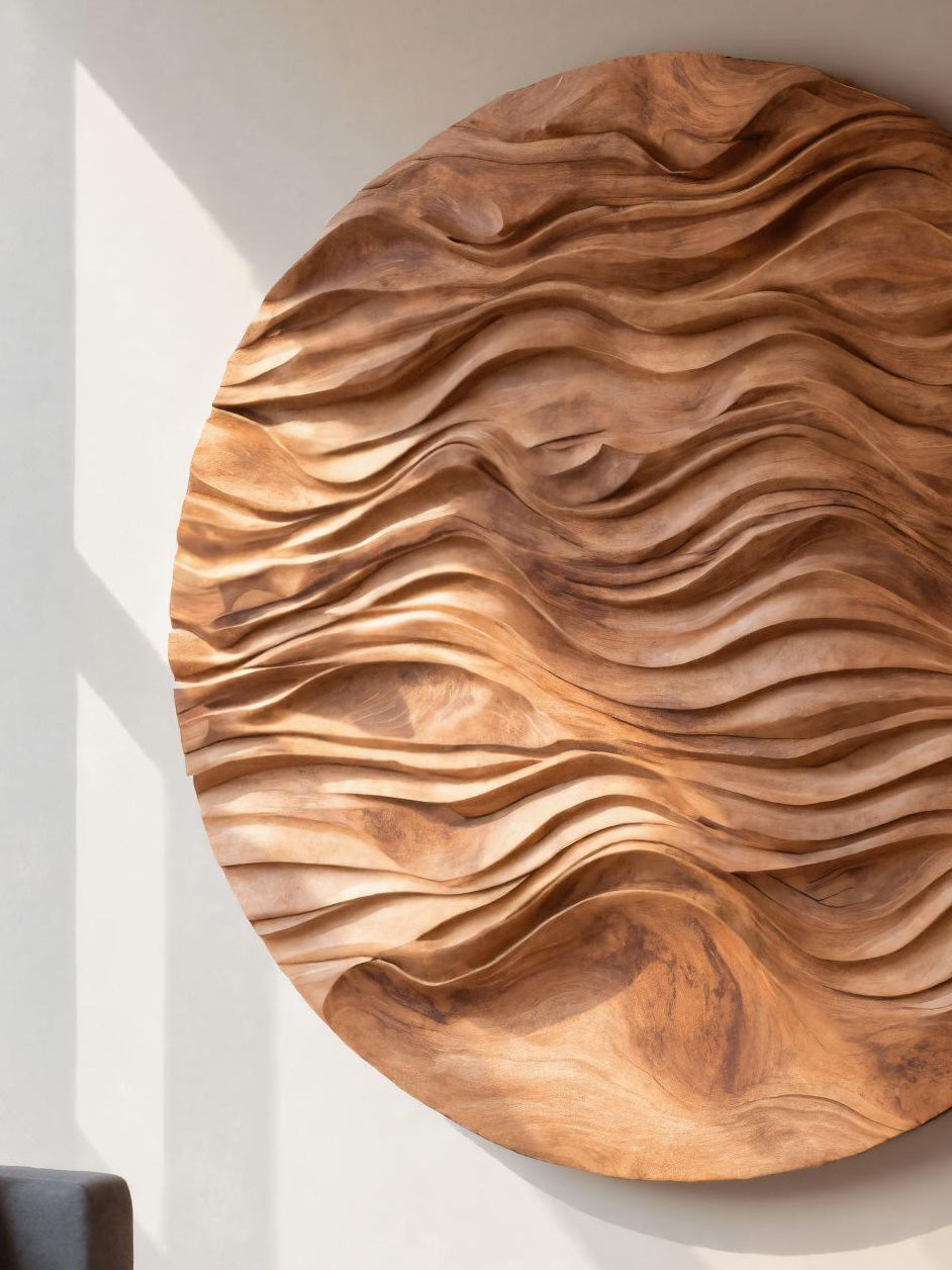 This round wall-mounted artwork features layered, wave-like carvings that evoke the flowing textures of clouds, lunar surfaces, or gentle ripples of water. The circular form brings balance and harmony, while the intricate details highlight organic movement. Its sculptural depth creates a play of light and shadow, enhancing the atmosphere of any interior.