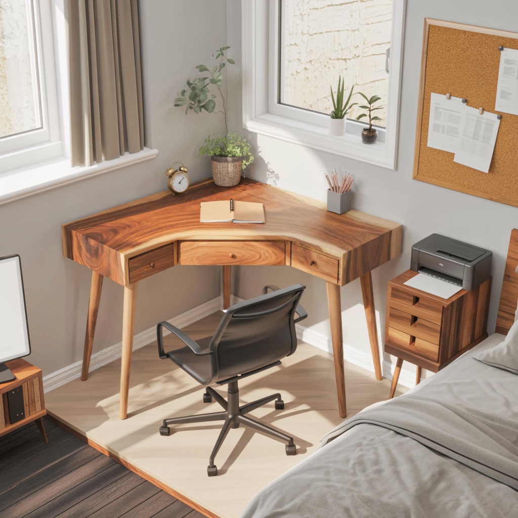 Elevate your workspace with our Mid Century Corner Wooden Desk With Drawer For Home Office Or Study, thoughtfully designed to maximize space while bringing natural warmth and sculptural charm into your interior. Its compact yet functional form makes it a versatile addition to any corner, blending utility with timeless style.