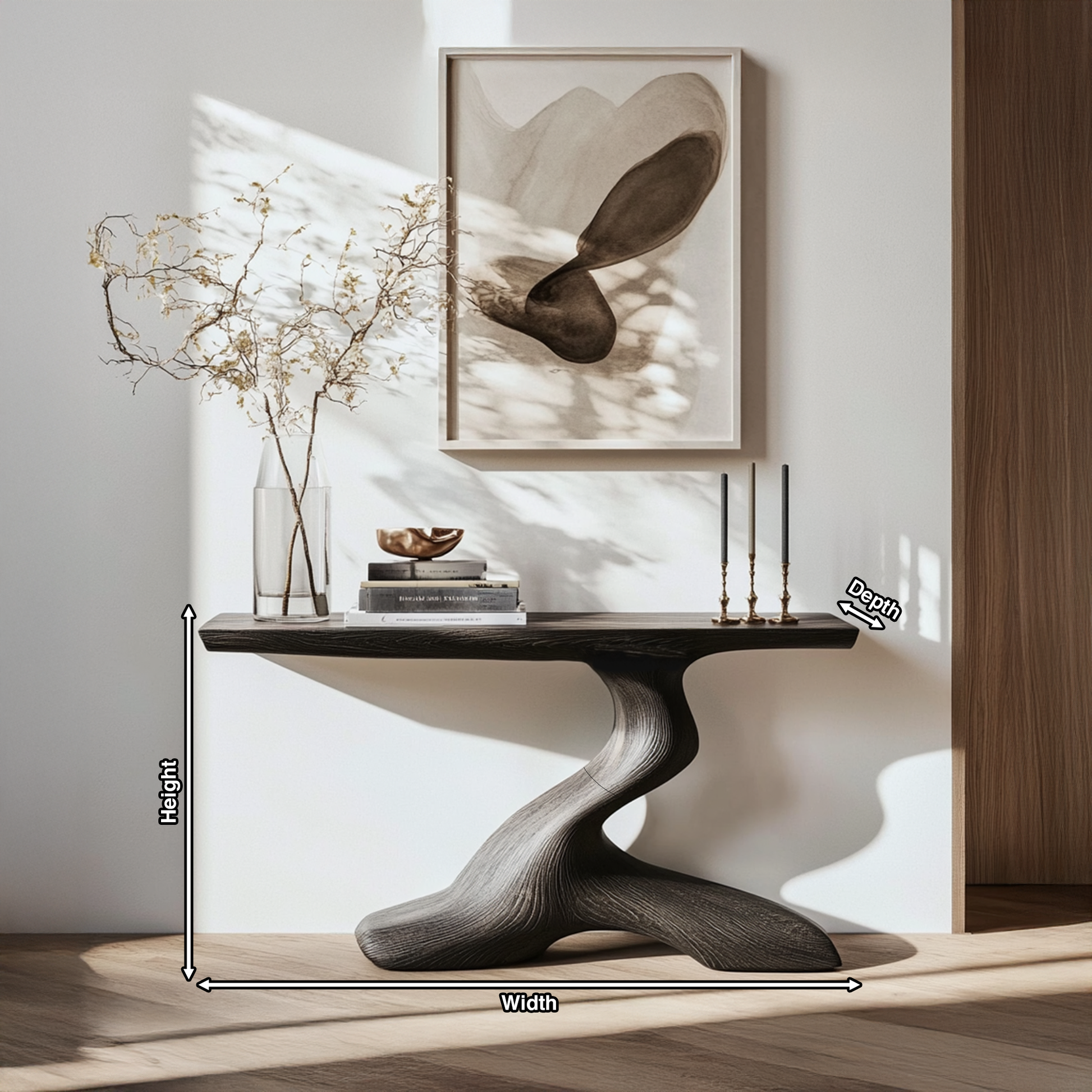 Crafted from premium solid wood, each console table highlights the organic elegance of natural materials. Please note that the wood grain variations depicted in the images are for reference only, as each table is one-of-a-kind with its own distinct grain and pattern. This individuality ensures you’re investing in a truly unique piece of furniture that adds a personal touch to your home.
