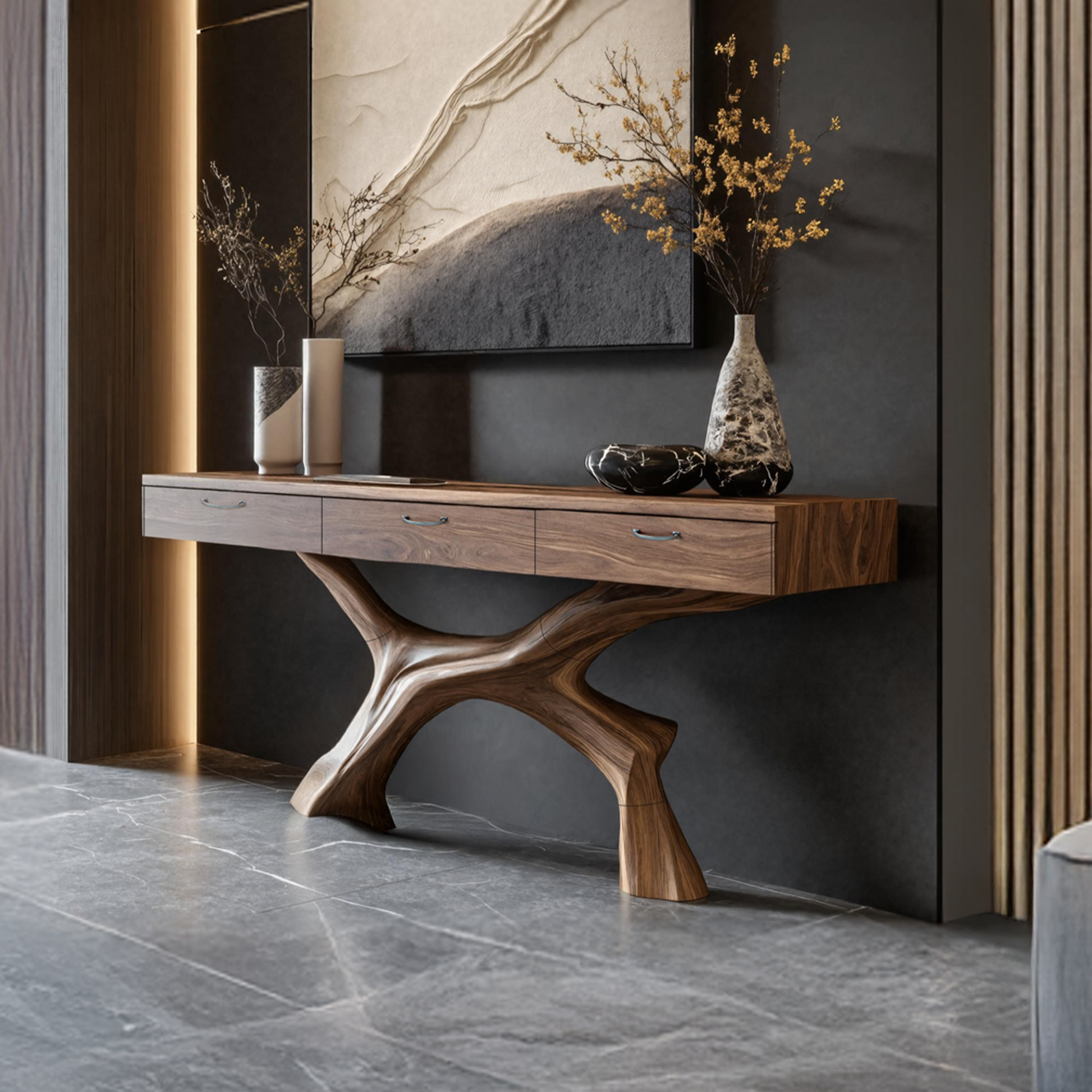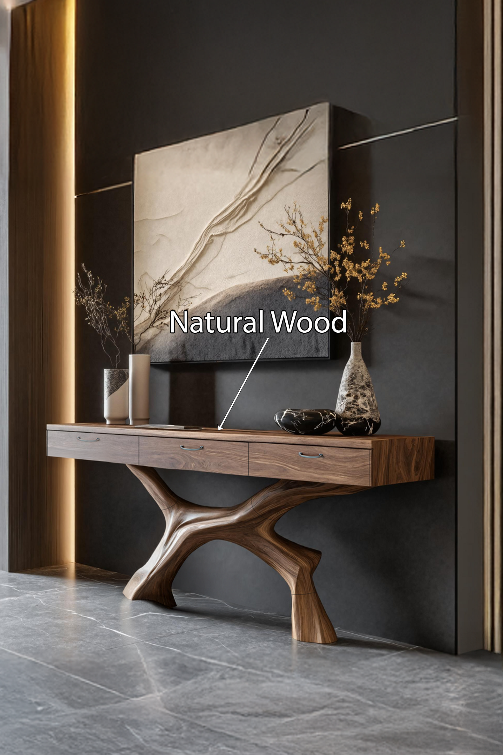 Crafted from premium solid wood, each console table highlights the organic elegance of natural materials. Please note that the wood grain variations depicted in the images are for reference only, as each table is one-of-a-kind with its own distinct grain and pattern. This individuality ensures you’re investing in a truly unique piece of furniture that adds a personal touch to your home.