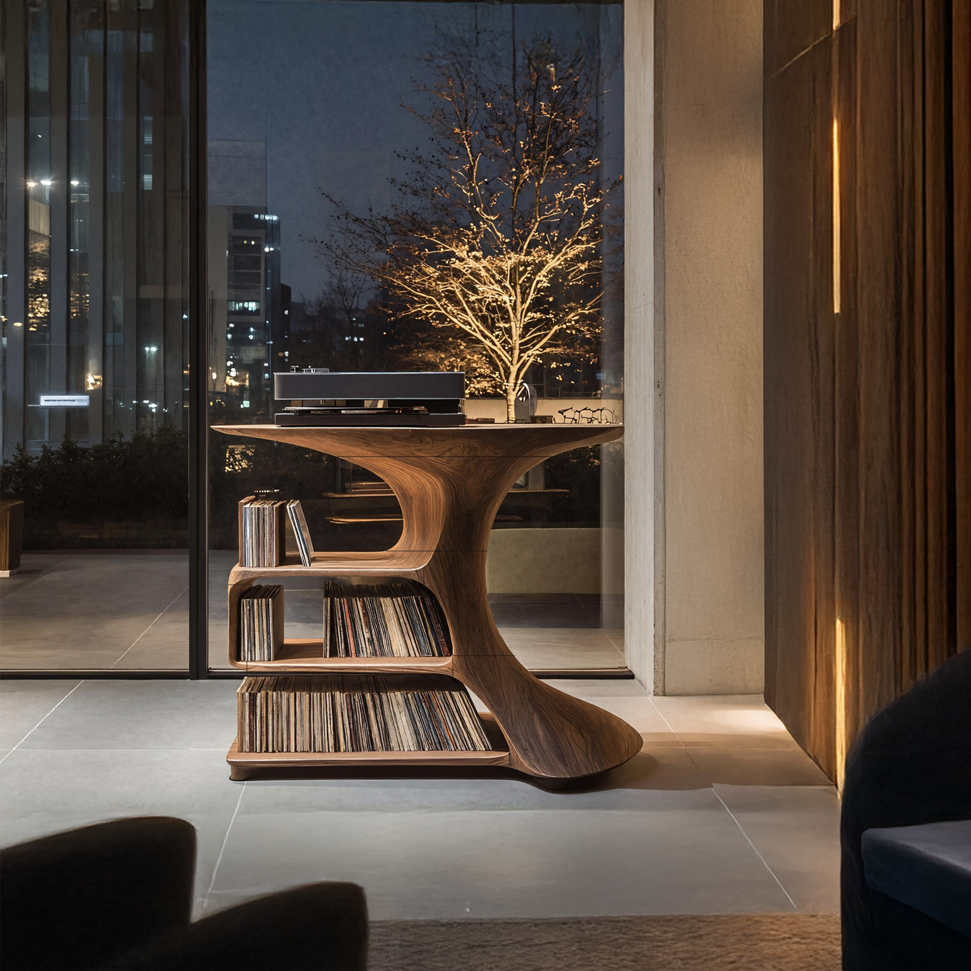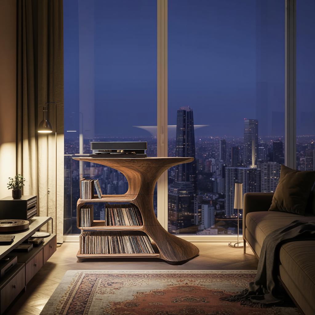 Crafted with a sleek, minimalist cube profile, this record stand enhances both modern and traditional interiors. The natural wood tones and unique grain patterns of each piece create a one-of-a-kind design, making it a stylish and functional addition to your space.