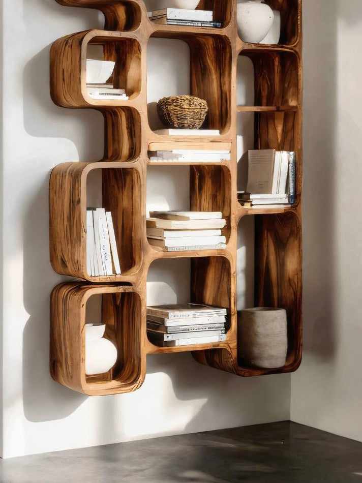 This bookshelf presents a bold geometric form with seamlessly integrated compartments that vary in size, perfect for books, ceramics, or curated décor. The wall-mounted construction enhances vertical space while its rhythmic silhouette creates balance and sophistication.