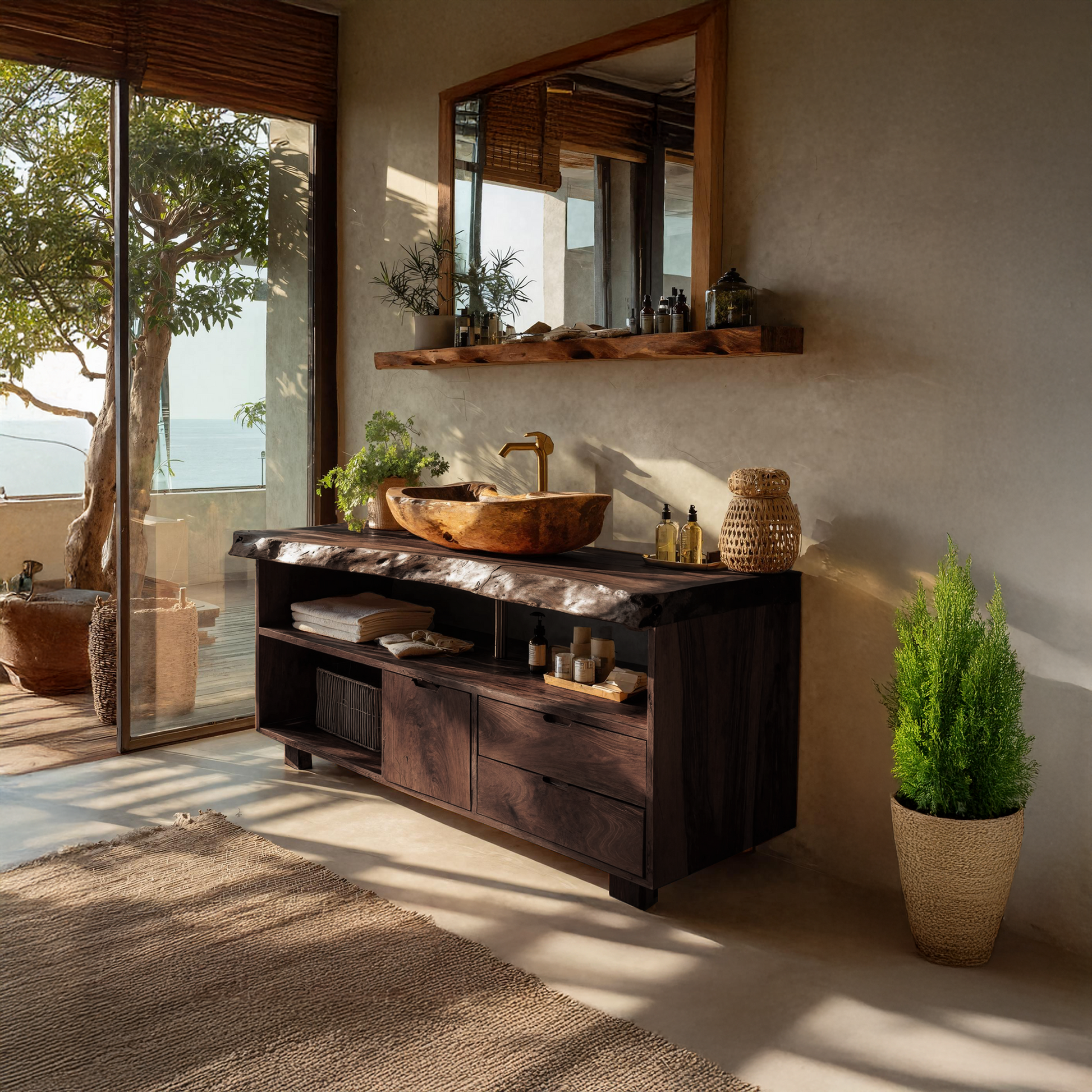 Revitalize your bathroom with our Handmade Wooden Bathroom Vanity, a perfect fusion of rustic charm and modern elegance. This vanity is thoughtfully designed to enhance both the style and functionality of your bathroom, making it a standout piece in any modern home.