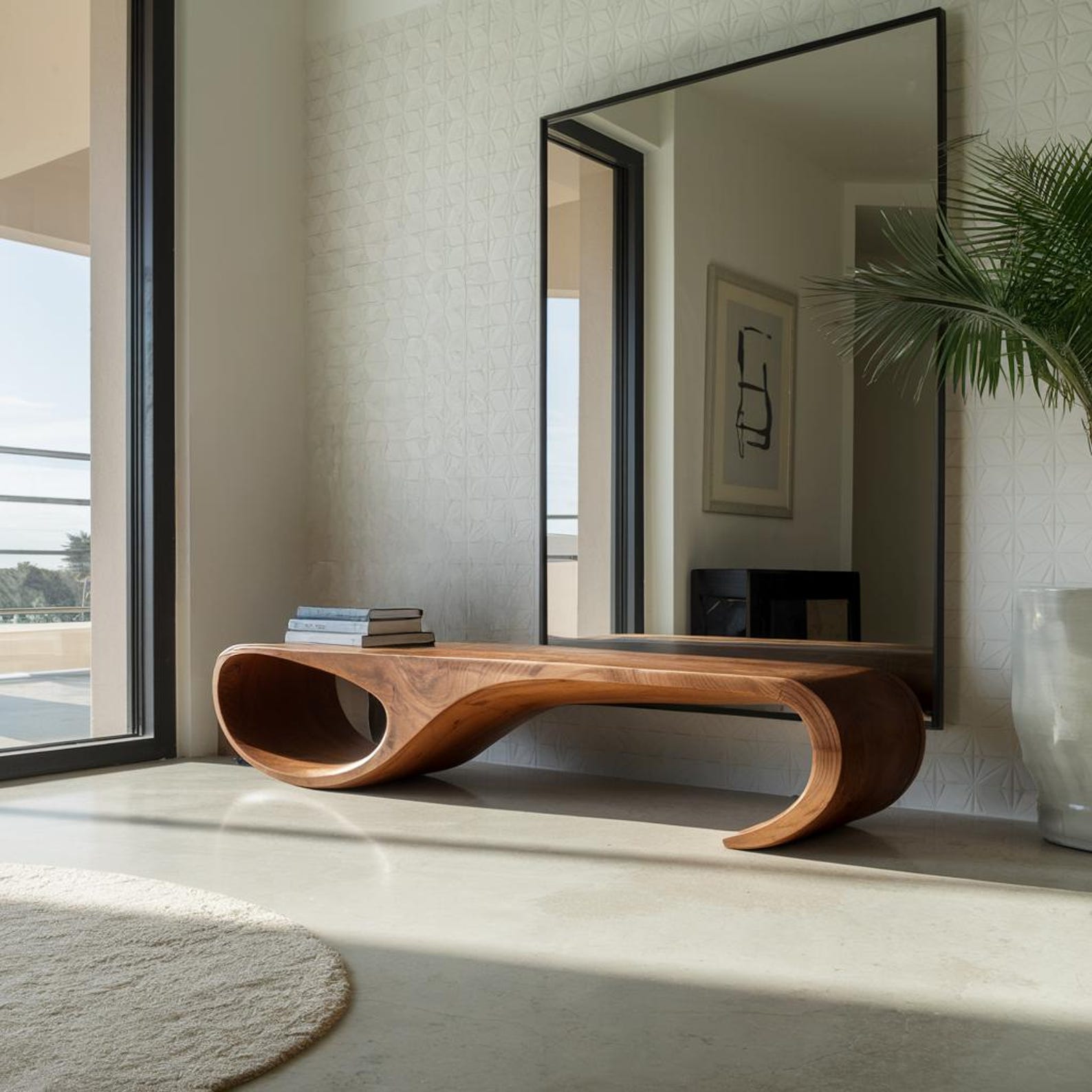 This bench features a bold, continuous curve that loops from one end to the other, forming a seamless silhouette with built-in storage potential. Its hollowed base offers a place for books or decor while preserving a clean visual line. Whether used as an entryway accent, a foot-of-bed bench, or low-profile media console, the form makes a subtle yet distinctive statement.