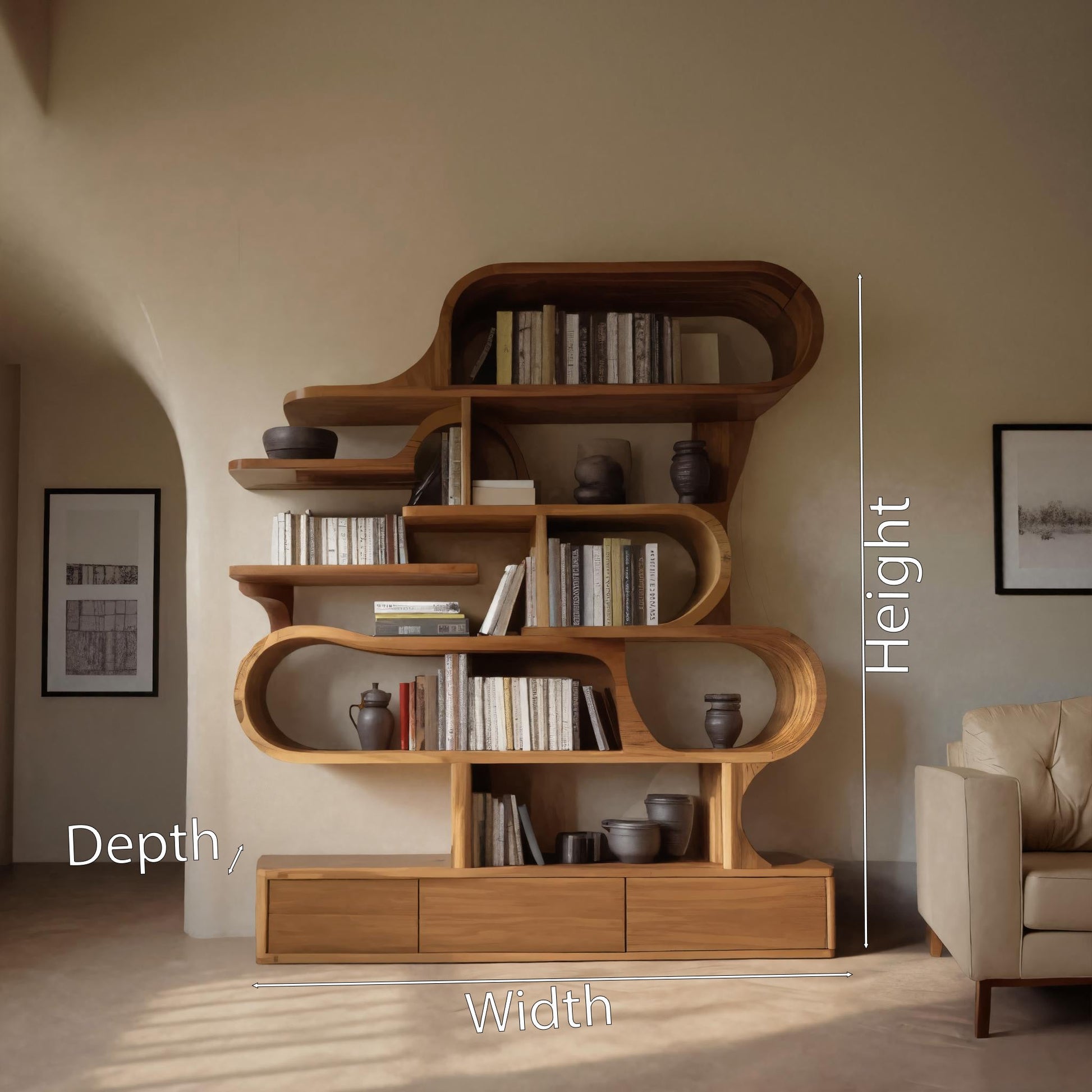 Discover the Elegance of Sculptural Design with Our Modern Sculptural Bookshelf With Curved Design For Living Room Or Office, created to bring flowing form and natural warmth into your space. This statement bookshelf enhances interiors with its organic silhouette and seamless functionality, turning storage into an artful experience.