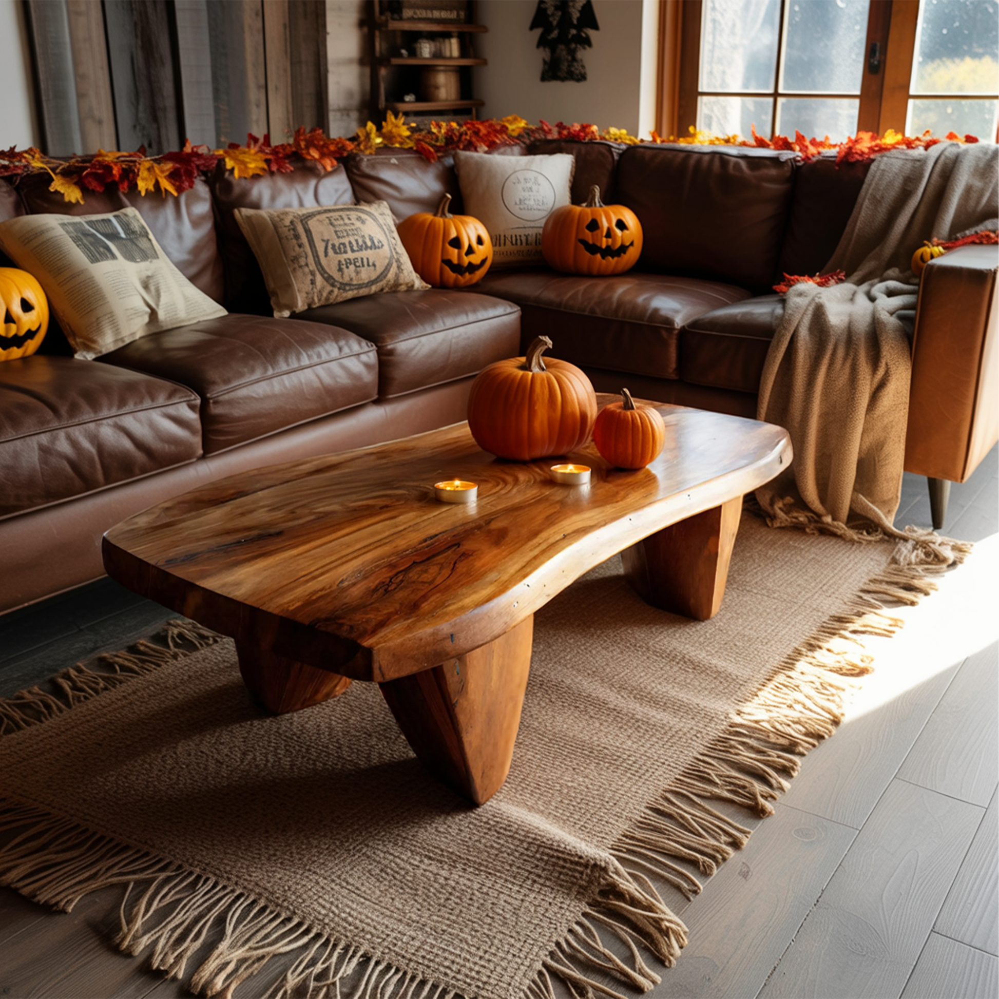 Elevate your living room with the Modern Wooden Live Edge Coffee Table For Living Room Halloween Decor. Crafted from solid wood with a sleek live edge finish, this modern piece blends natural beauty with spooky charm, making it the perfect centerpiece for showcasing pumpkins, candles, and festive Halloween accents.