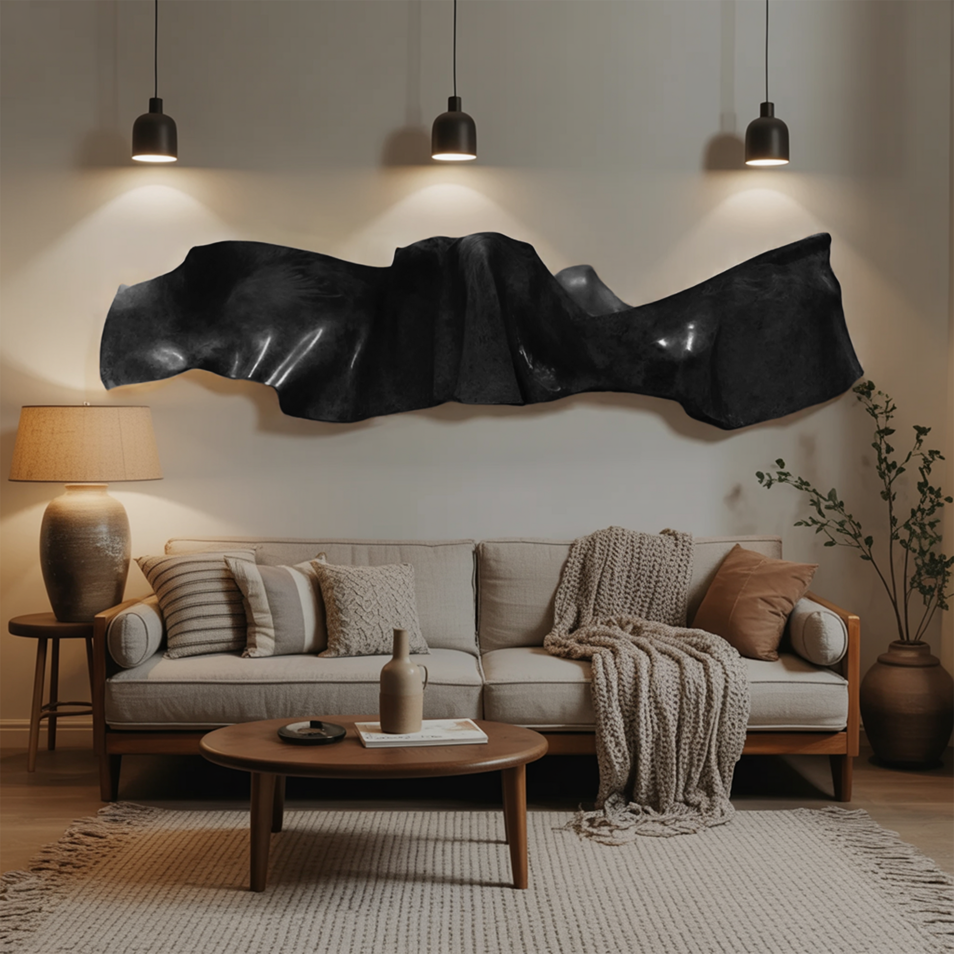 This wall-mounted art panel marries sculptural relief with minimalist form. Smooth undulations and crisp folds are carved directly into solid wood, creating depth and movement that catch light throughout the day. Its free-flowing silhouette contrasts subtly with the clean, rectilinear mounting, making it a captivating focal point in any modern interior.