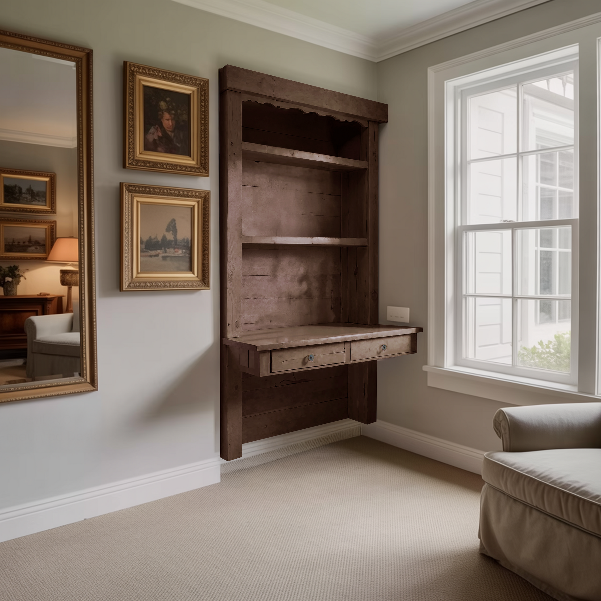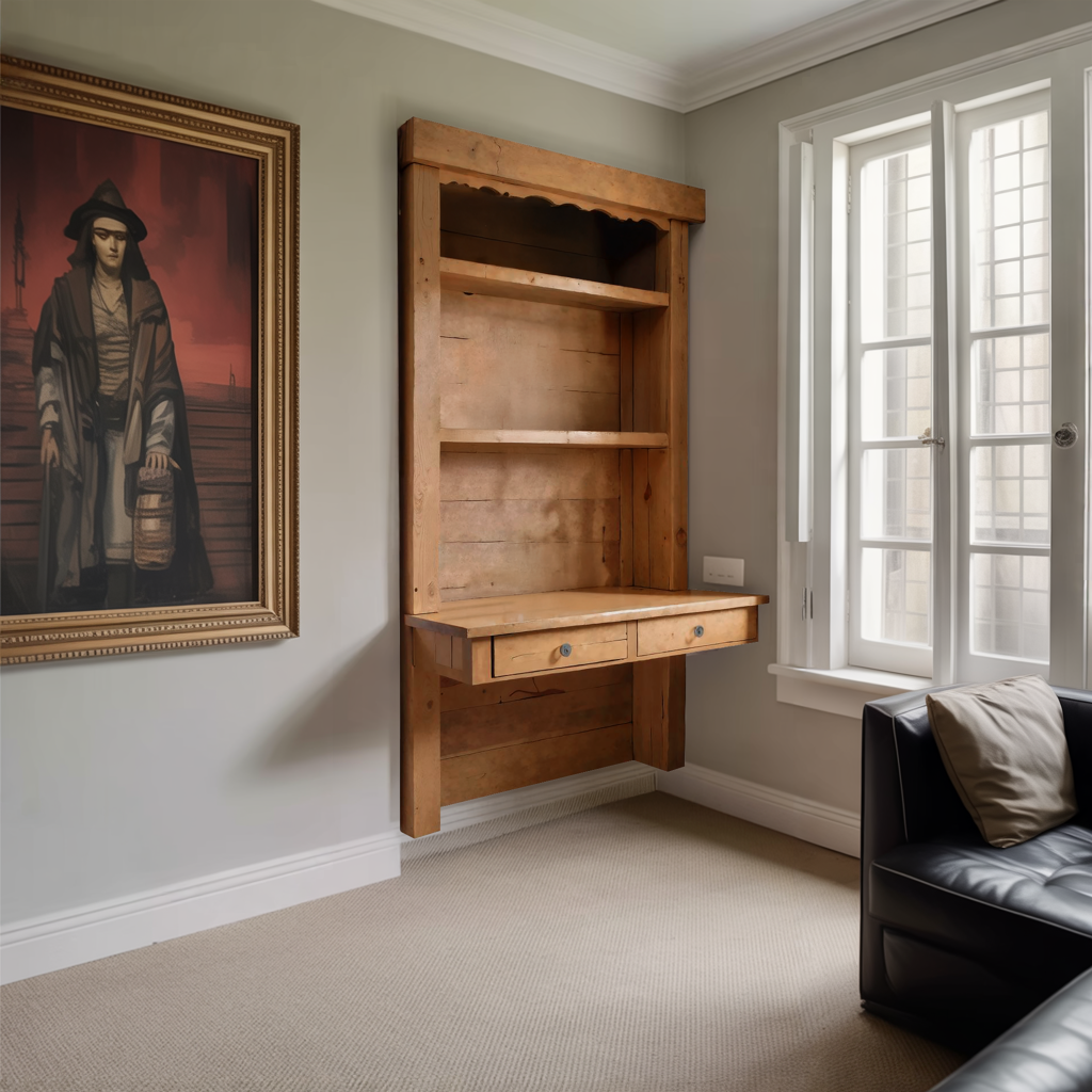 Crafted with farmhouse-inspired character, the desk features a built-in structure that combines storage shelves with a practical floating work surface. The natural wood back panel and drawers bring rich texture and visual depth, while the elevated design leaves the floor open — creating an airy, uncluttered look. It’s the perfect mix of rustic tradition and modern efficiency, suited for cottage-style, vintage, or minimalist interiors.