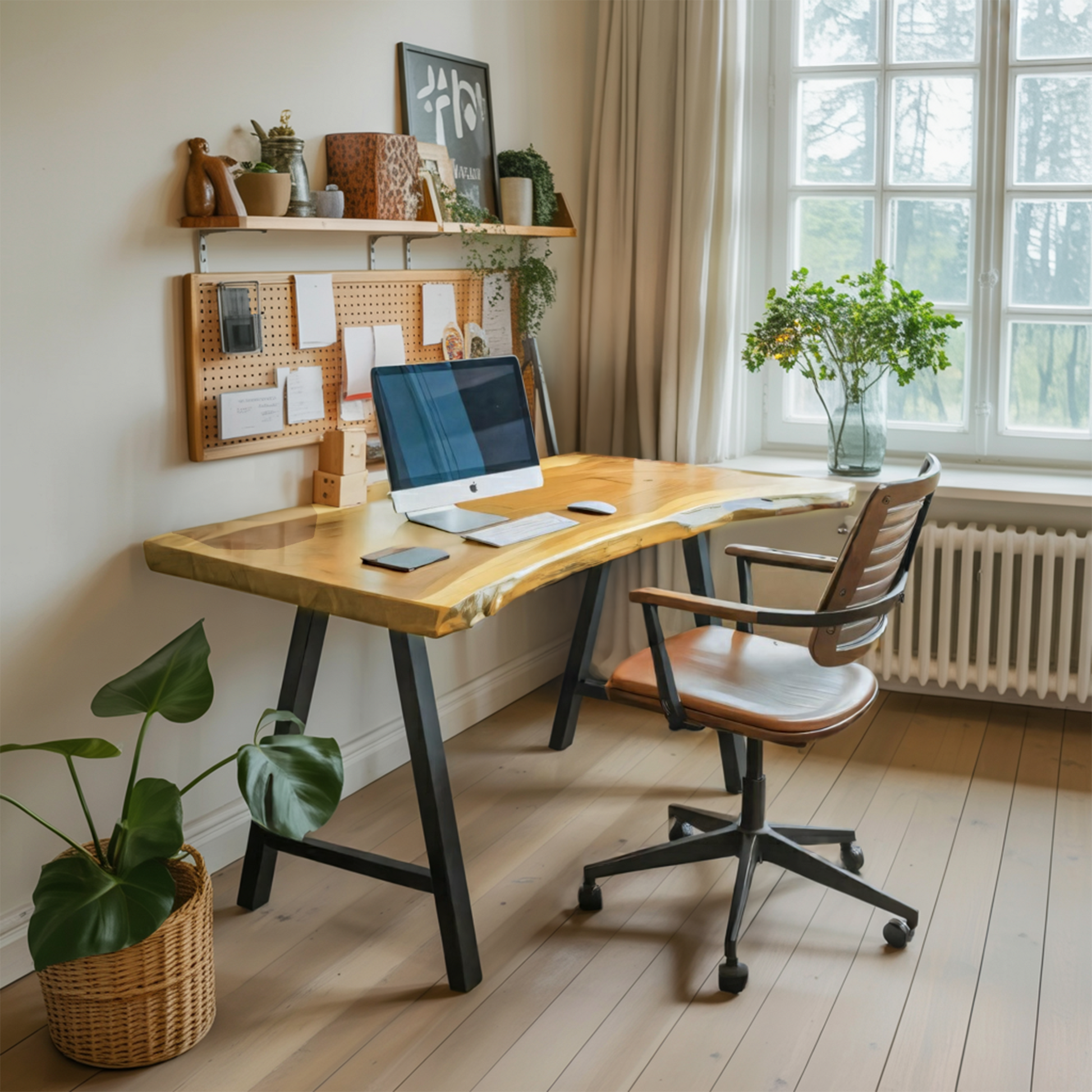 This handcrafted desk features a striking live edge tabletop that follows the natural contour of the wood, paired with sturdy, powder-coated metal legs for a balanced contrast between organic and structural elements. The broad surface provides ample space for laptops, books, or creative tools, while the irregular edge introduces a quiet, flowing dynamic into the home office — encouraging focus and visual calm.