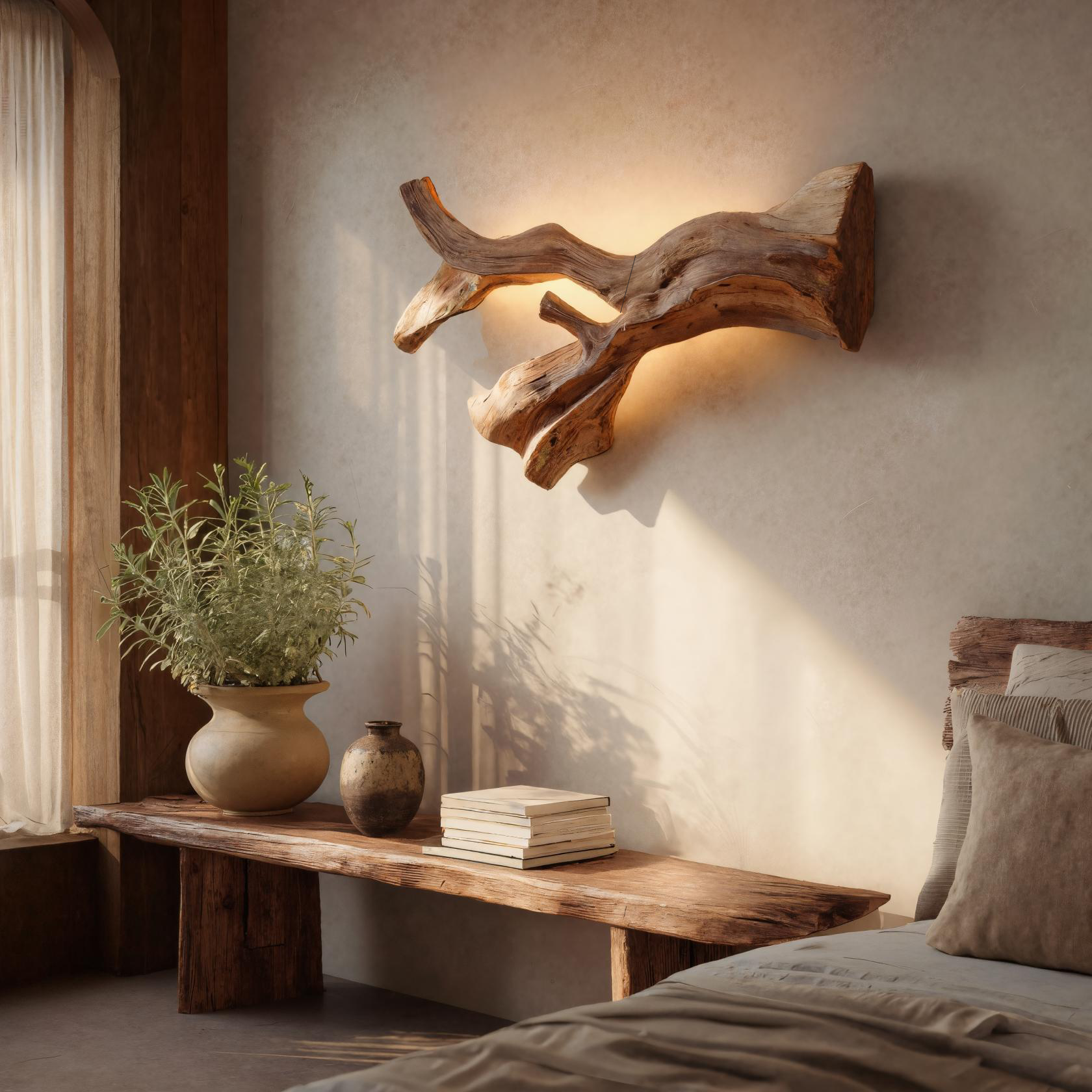 This wall lamp features a solid wood branch form that showcases the unique lines, curves, and textures of nature. Its natural silhouette blends rustic appeal with functional design, making it ideal for hallways, entryways, or intimate bedroom corners where soft, ambient lighting is desired.