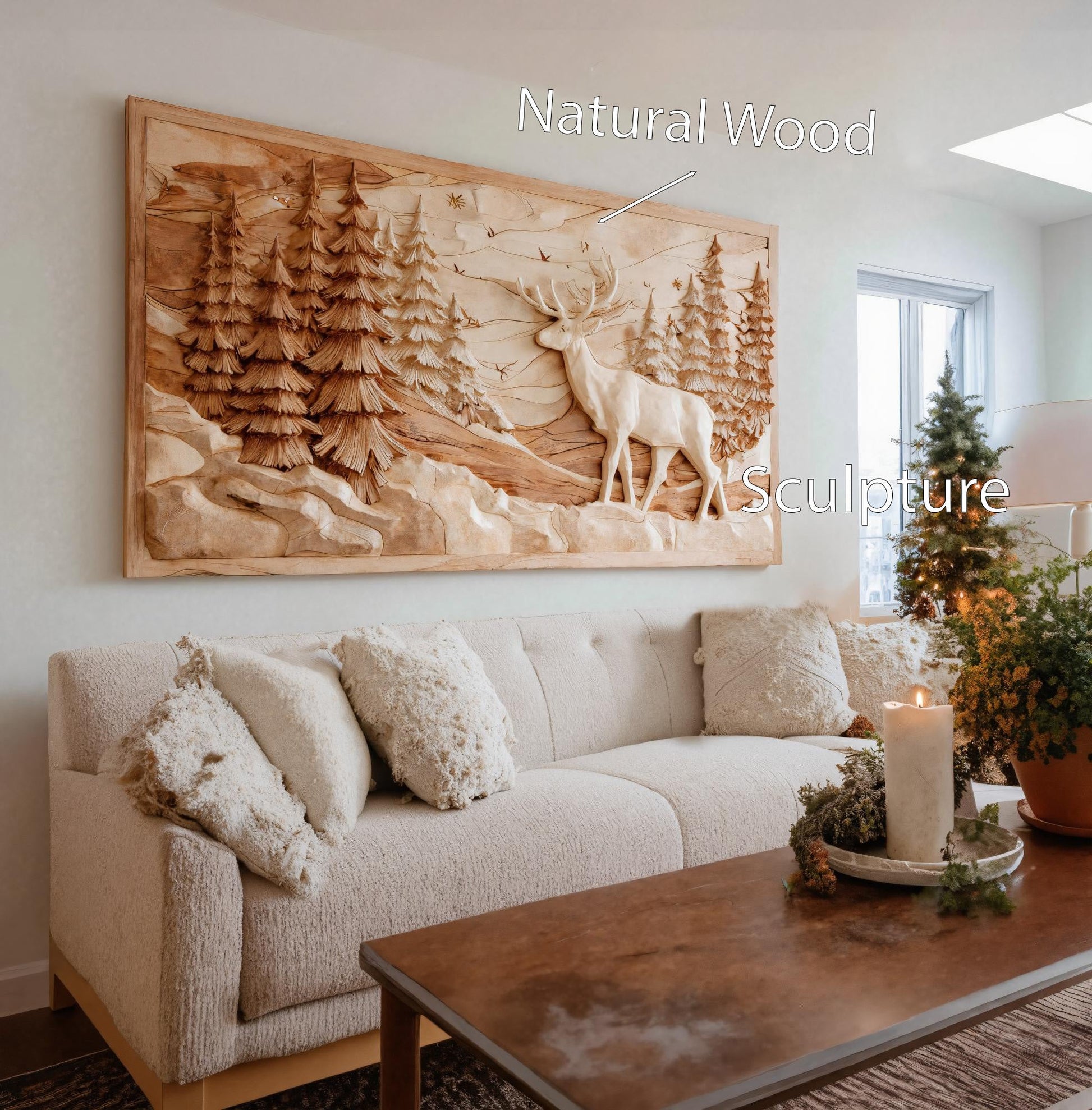 Rustic Wall Art With Carved Deer Scene For Living Room