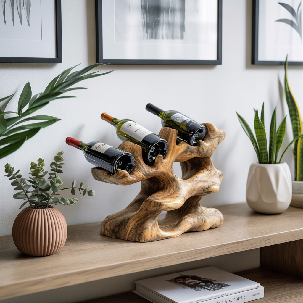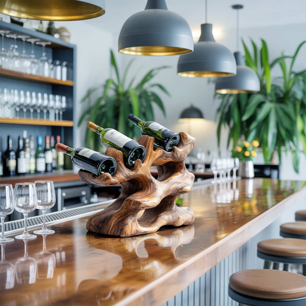 Each wine holder is individually handmade from solid, sustainably sourced Monkeypod wood. The organic grain patterns, rustic tones, and subtle variations in texture make every piece entirely unique. Its artisanal finish preserves the natural warmth of the wood while offering a tactile, earthy appeal that feels both rustic and refined.
