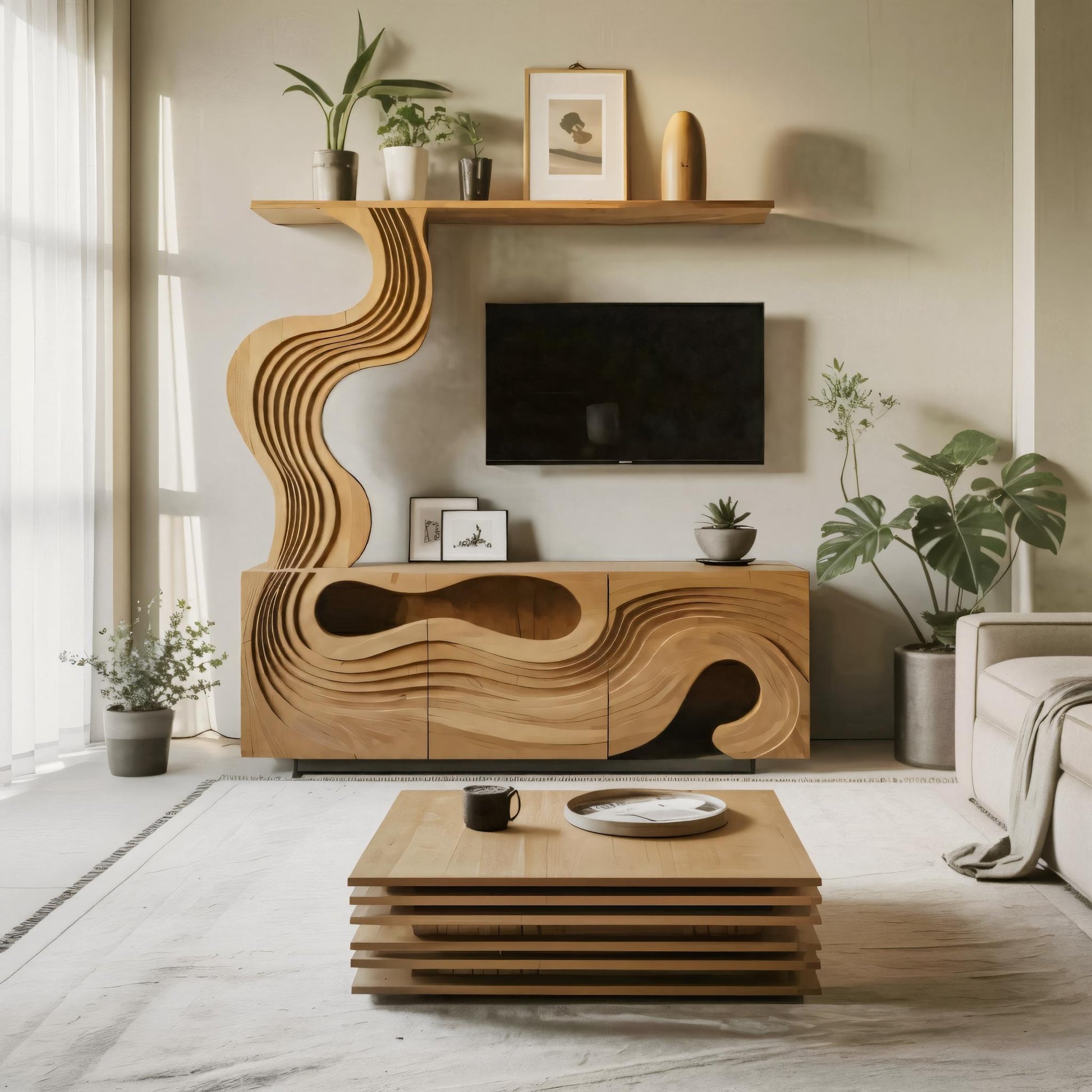 Flowing form meets organized storage in the Sculptural TV Console With Wave Layers Entertainment Cabinet For Living Room And Media Wall, crafted to become the centerpiece of your entertainment area.